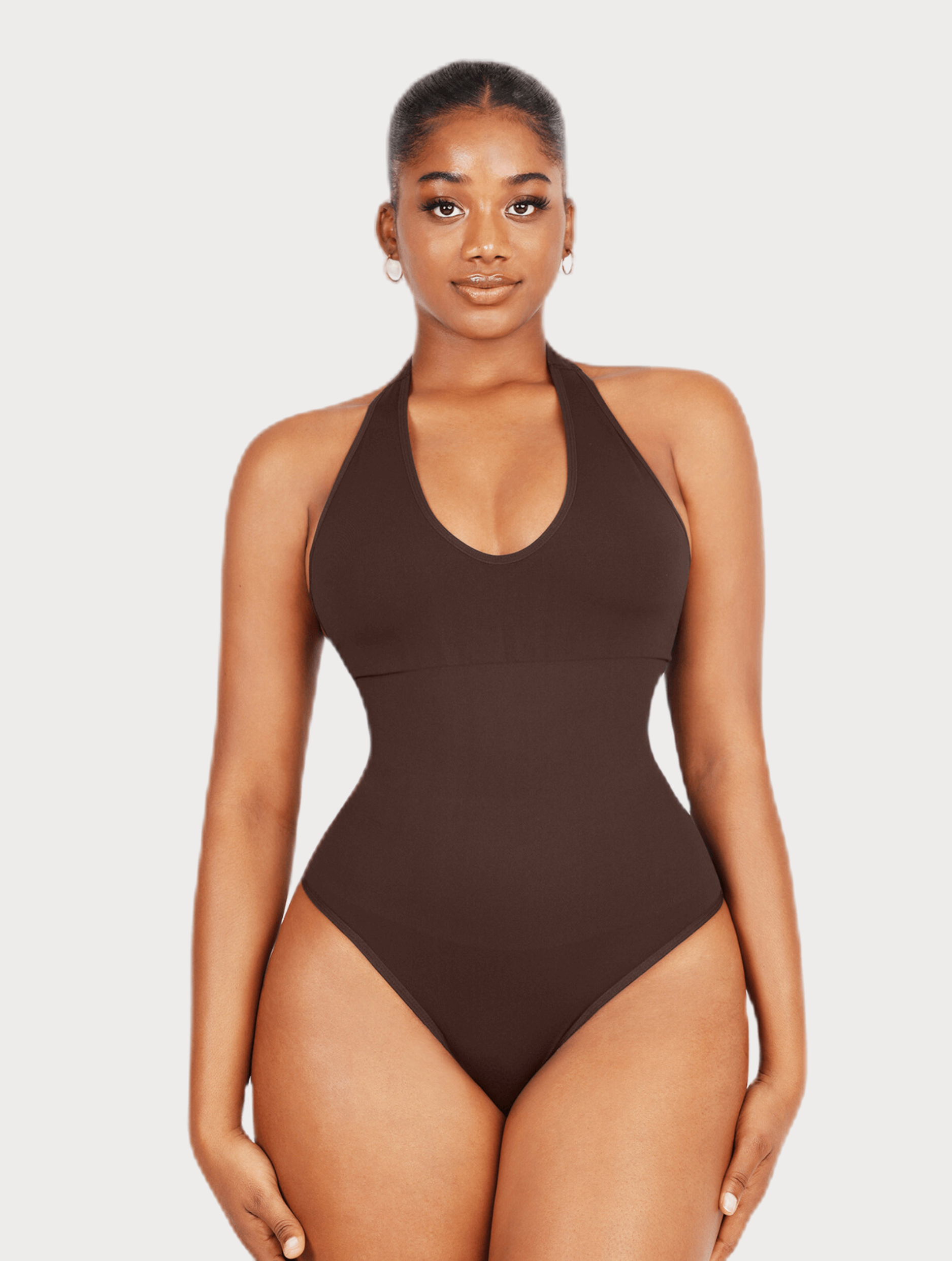 Experience comfort & softness in our Halter Bodysuit Shapewear! Tummy-control & arm slimming fabric guarantee desired results, while the retro deep-V neck and spaghetti straps complement your look. Added breast support and double-layered design with removable cotton cups provide better coverage. Finally, a thong-style design and snap closure around the crotch make this piece perfect for any occasion. Take the plunge and put your curves on display with our Halter Bodysuit Shapewear!