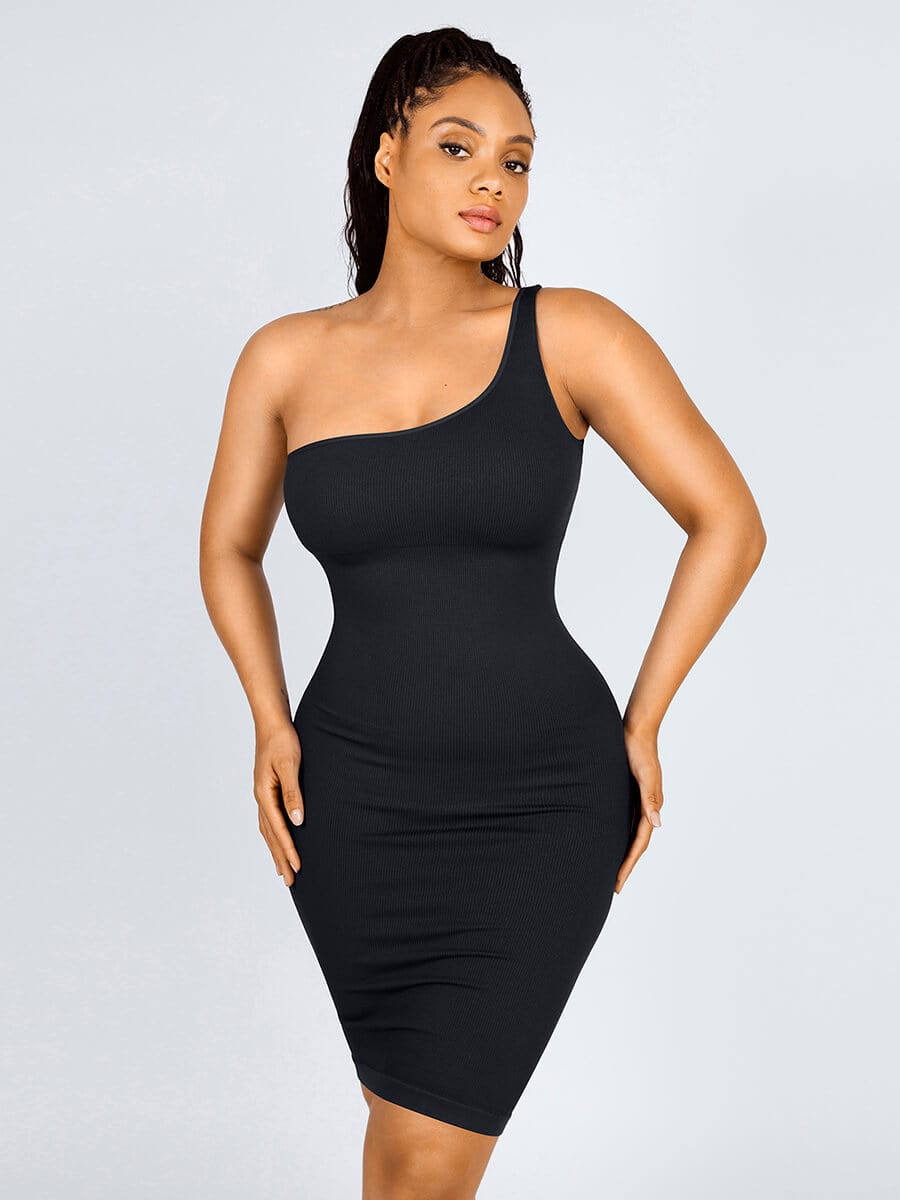 -One-shoulder slanted neck look to emphasize your sexiness -Elastic compression fabric with 360 waist & abdominal control -Soft & comfortable rib twill texture